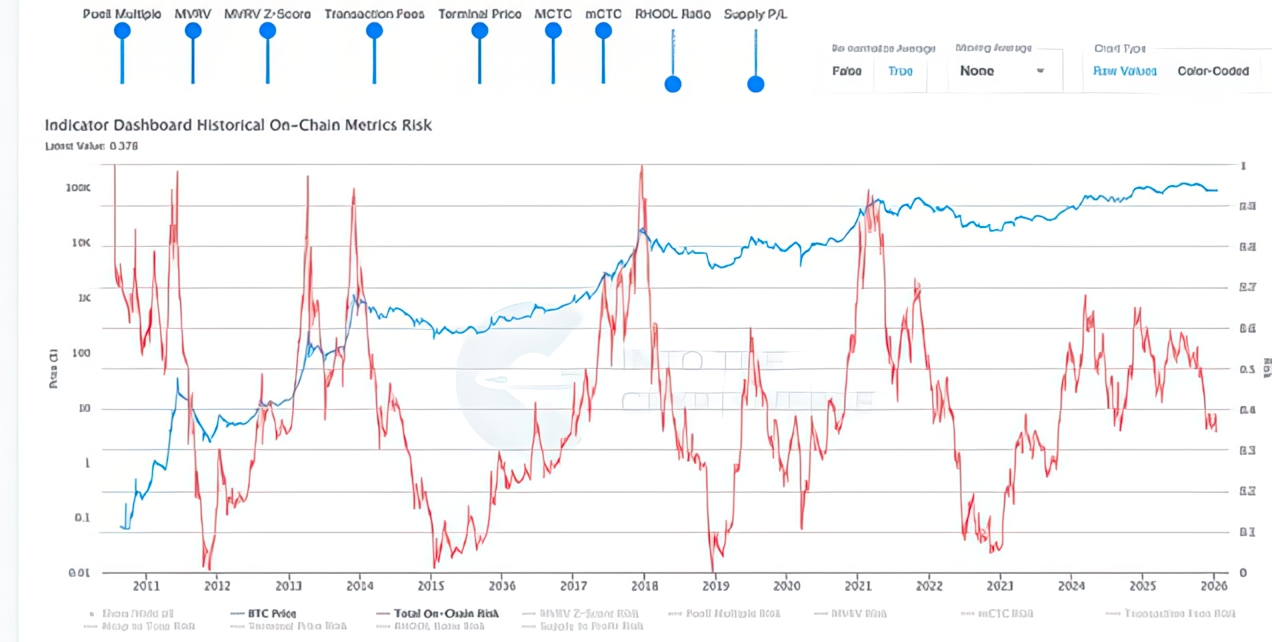 The on-chain risk model aggregates multiple structural indicators of Bitcoin’s internal market health into a single composite regime signal. These inputs include valuation measures (such as realized price, cost basis dispersion, and profitability), investor behavior (long-term holder spending, coin age distribution, and dormancy), and network activity (transaction flows and supply turnover).