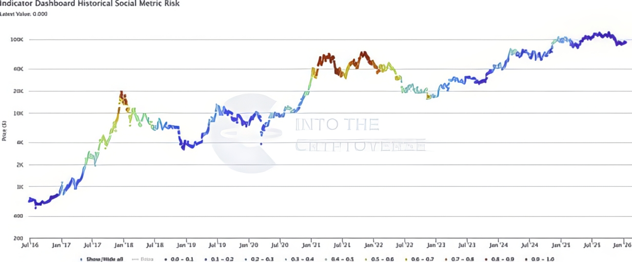 The 2025 peak was fundamentally different. Despite Bitcoin reaching new all-time highs, measures of social and speculative participation remained muted. A composite Social Risk Index constructed from content consumption, exchange activity, and crypto-related social discourse shows that engagement was near historical lows relative to price.